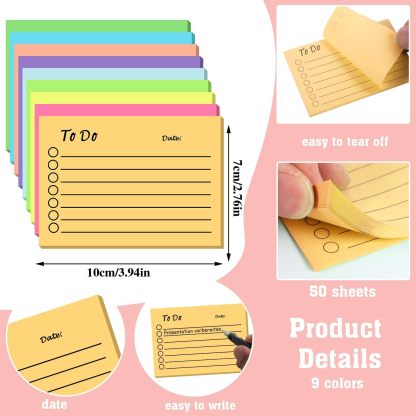 - ��Package Includes��This do list sticky notes set contains 9 different colors, rose, pink, purple, light blue, dark blue, light green, dark green, orange, and yellow. There are 50 sheets of each, 450 sheets in total. The number is sufficient and the colors are diverse, which can meet your needs for a long time.