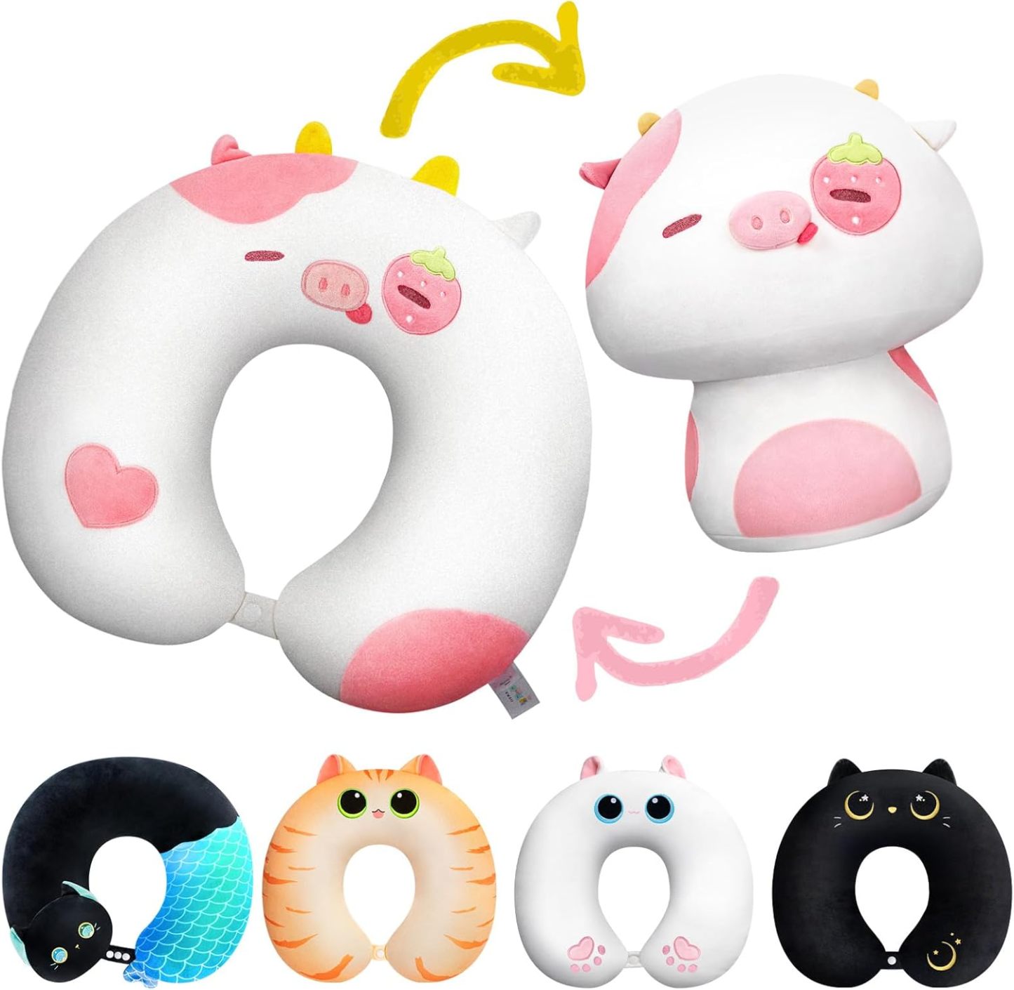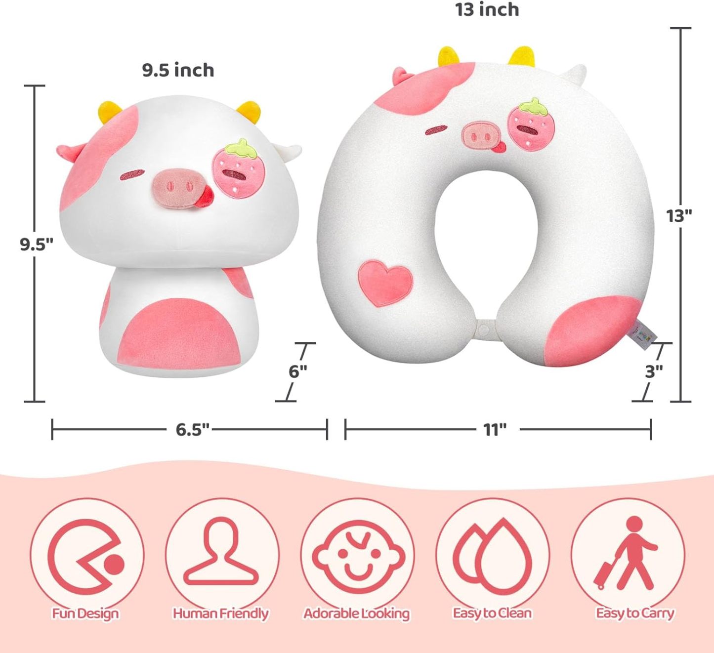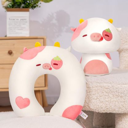 Mewaii Kids Travel Pillow, Cute Strawberry Cow Stuffed Animal Plush, Cartoon Neck Pillow for Kids & Adults, Reversible Plush Squishy 2-in-1 Plush Toys for Airplane, Car, Train(13 Inches)